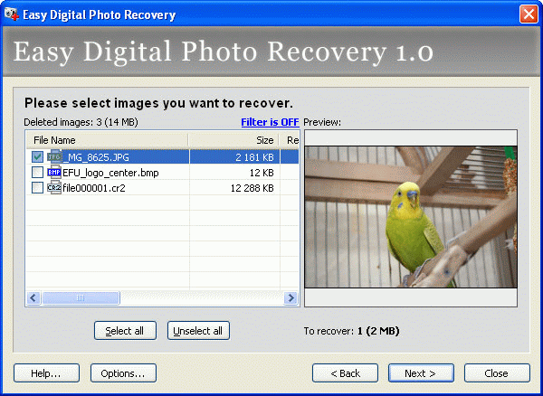 Easy Digital Photo Recovery je nástroj pro obnovení nechtěně smazaných digitálních fotografií ve formátech JPEG, TIFF, ORF, RAF, MRW, DNG, X3F, BMP, GIF a mnoha další. Fotografie je možno obnovit přímo z paměťových karet, USB disků i klíčenek, z pevného disku apod. Podporovány jsou soborové systémy NTSF, FAT32 i FAT16. Program má jednoduché ovládání a přehledné uživatelské prostředí.