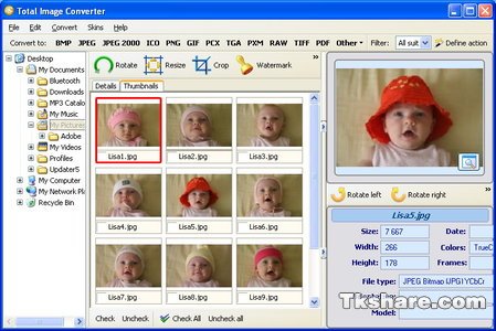 Total Image Converter převádí obrázky do jiných formátů, změní velikost a otáčí je. Podporuje TIFF, JPEG, PSD, RAW (CRW, CR2, NEF, PEF, RAF, X3F, ORF, MRW), PNG, BMP, PSD, TGA a mnoho dalších obrazových formátů. Total Image Converter převádí velké TIFF JPEG do malých, je vhodný pro fotky na web nebo obnoví staré fotografie z nepodporovaných formátech v několika málo kliknutích.