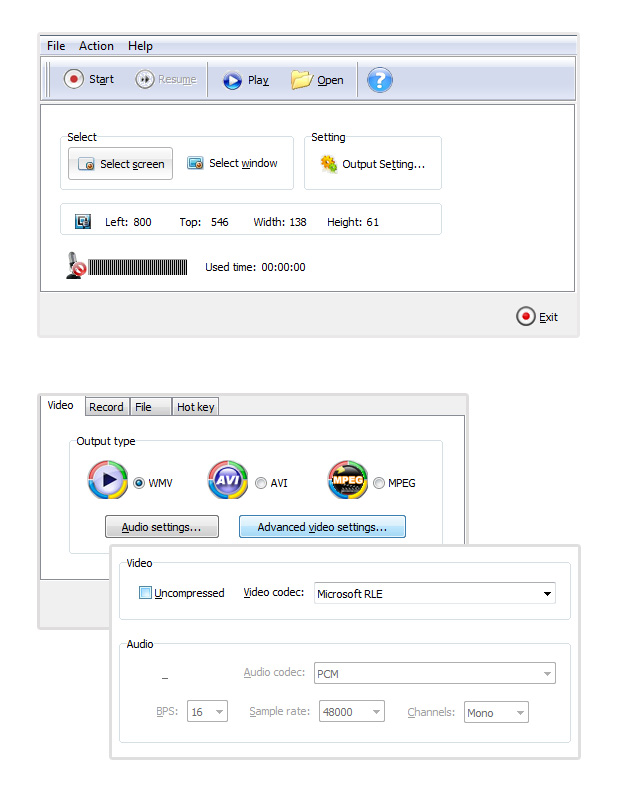 Záznam monitoru anebo okna - výstupní obraz-perfektní videa a zvukové stopy vložené do formátu WMV, MPEG nebo AVI.