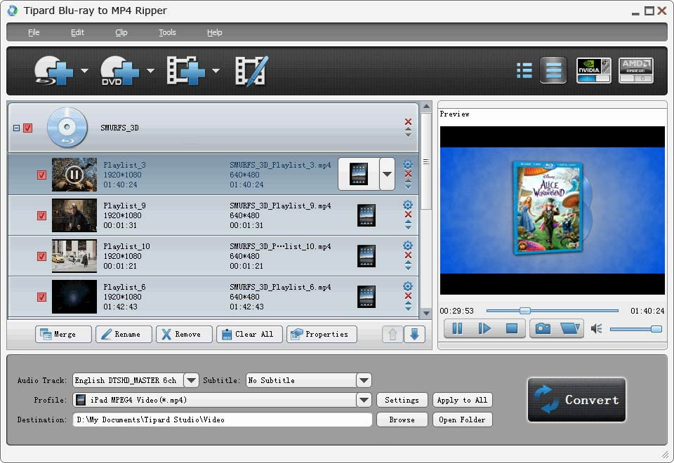 Tipard Blu-ray to MP4 Ripper poskytuje řešení pro uživatele na rip Blu-ray/DVD a převádět videa do formátu MP4. To podporuje Blu-ray Disc / složky / ISO soubory (je zapotřebí interní nebo externí Blu-ray disk), DVD disků, složek, IFO soubory a různé video / audio formátů (TS, MOV, WMV, MXF, MKV, AVI, atd.). Kromě toho, s výjimkou MP4, ale také podporuje mnoho dalších výstupních formátů, jako VOB, TS, MKV, WMV, M4V, atd.). Navíc, tyto výstupní profily, včetně video / audio kodek, bitrate, rozlišení a tak dále lze nastavit podle potřeby.