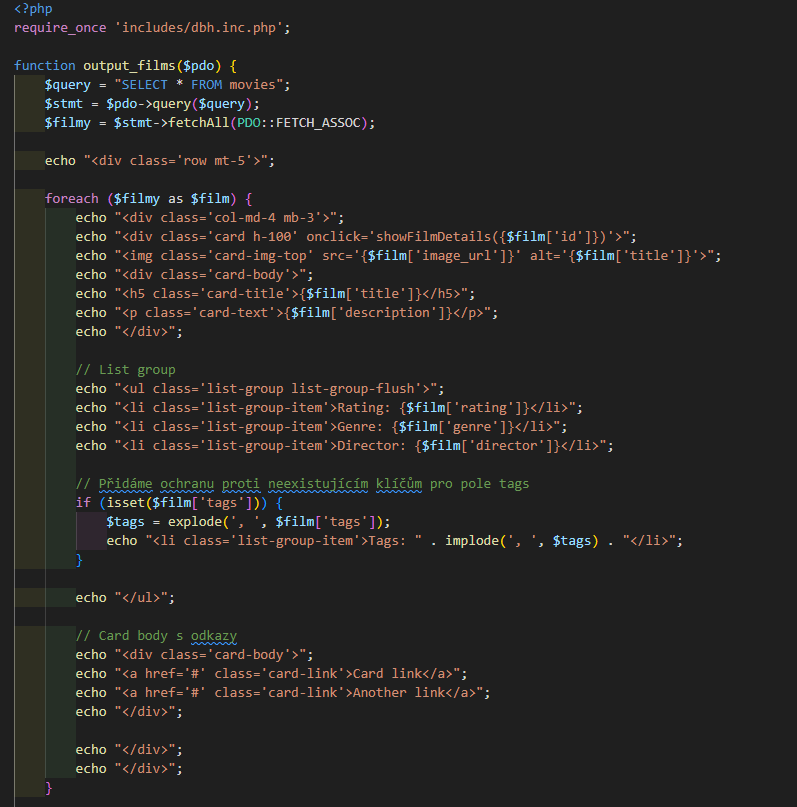No jde o to, že ten output_films.inc.php je kompletní kod (tedy model a view v jednom souboru) na výpis filmu do stránky. A já se snažím, teď to rozdělit do těch souborů jako index_model.inc.php, index_view.inc.php a index.contr.inc.php. Jenže někde mi hapruje to posílání dat mezi soubory a funkcemi.