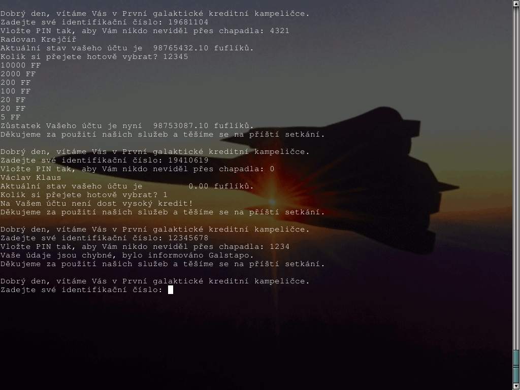 castka = zadat("Kolik peněz chcete vybrat:");Dáš té metodě text který má vypsat, a na oplátku dostaneš číslo které vložil uživatel. Akorát bacha na záporná čísla, to bych ošetřil přímo v té metodě, protože v žádném případě nesmí být možné záporné číslo zadat, a hlavně ne u částky která se má "vybrat"! Tohle kdysi fungovalo v některých špatně navržených eshopech, takže pár zvídavých lidí si objednalo zboží a ještě dostali peníze na účet