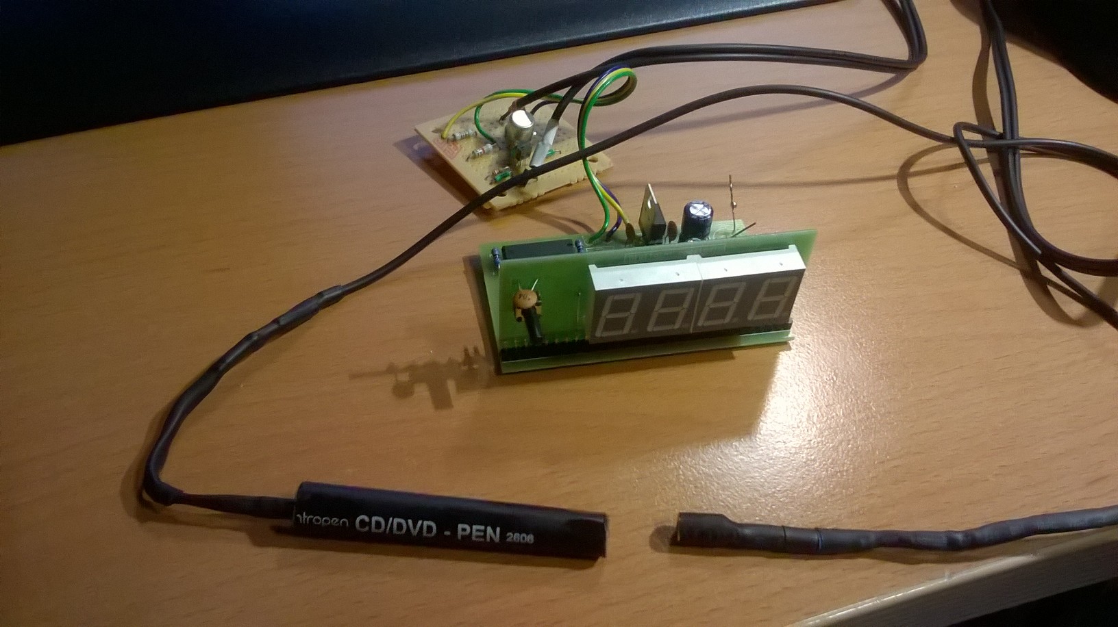 univerzální počítadlo - v tomto případě je určeno pro počítání závitů. Onen bastl vzadu je Schmidtův klopný obvod s hysterezí - to aby se usnadnila práce počítací logice. V uříznuté fixe je ukryt fototranzistor, naproti němu je laserová dioda. Ta je zdrojem paprsku, který bude protínat pásek přilepený na kostřičce cívky. Ale v podstatě to může počítat cokoli. Složení je jednoduché 4x 4026, 1x 4093 a sedmisegmentovky.