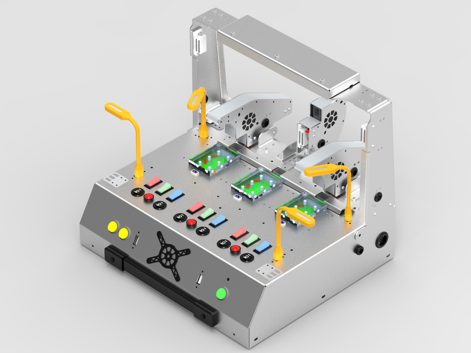 Zařízení obsahuje tři nezávislé pozice pro auta. Chlazení motorků bude možné zespodu a pod sundání karosérie a přiklopení horního ventilátoru i ze shora. Pro lepší zaměření proudu vzduchu jsou ve sklopné (kvůli převozu) rampě tři zaměřovací lasery. Autíčko se bude dávat na podstavec z plexi, jenž bude podsvicen, s možností zapnutí jednotlivých barev RGB. Jak chlazení, tak i posvícení se zapne buď ručně, či v automatickém režimu po položení autíčka na podstavec. Vepředu jsou dva USB konektory na nabíjení třeba mobilů a nahoře čtyři spínatelné USB určené pro USB lampičky. Jelikož nemám doma ještě všechny plechové díly, natož vše sešroubované, postnu sem jen jeho render.