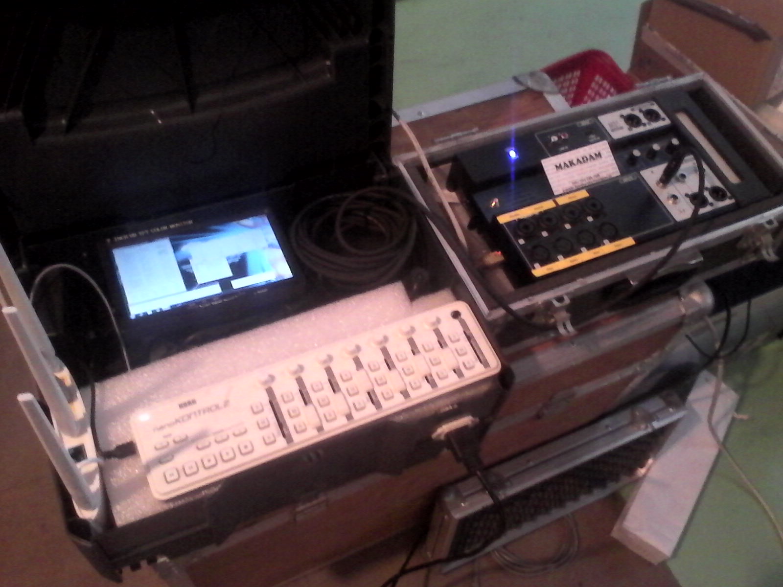 Nalevo je "notebook" sloužící k ovládání světel. Jeho srdce tvoří mini PC Acer Veriton s programem Music Visualization. Z mixu jde do PC signál, který program analyzuje a ovládá světla prostřednictvím protokolu DMX512. Tuto linku posílám ke světelným rampám bezdrátově. Samotné tělo je z boxu od vrtačky. Malý mixáček slouží k manuálnímu nastavení pozic scannerů a hlav, případně spuštění připravených scén. Zapínání a vypínání se provádí nahulváta kabelem. Součástí kufru je i 5GHz modem pro bezdrátové ovládání mixážního pultu vpravo.