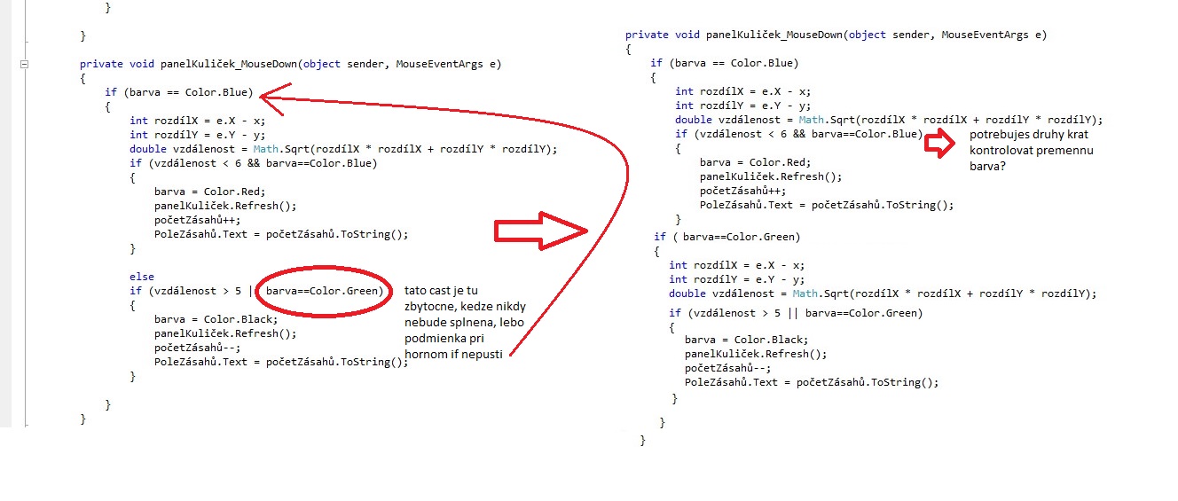 Mám problém s tím,že při vygenerování zelené kuličky(která se generuje náhodně) se má odečíst,po jejím zásahu,bod.Jenže se neodečte a nevím co s tím.