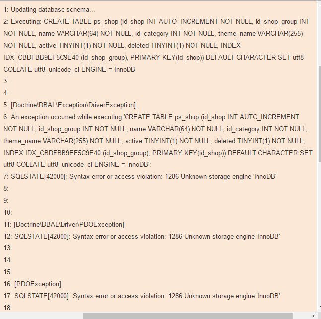 nejnovější verzi prestashopu, mám to nahraný serveru a všechny body instalace mi jdou až na poslední, tam se to zasekne na "Creating database tables " a vypíše tento error.