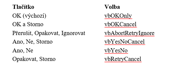 - Odlišnost zápisu. Do proměnné tlacitko se ukládá vrácená hodnota stisknutého tlačítka. MsgBox je nyní zapsán jako funkce, a proto je text, ikona+tlačítka a titulek v závorkách.