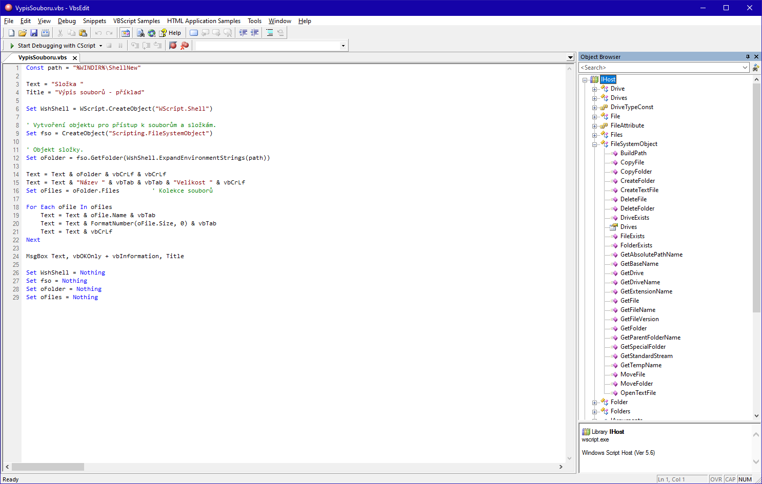 Jaký editor používat pro vbs? S úspěchem používám vbsedit/, který disponuje i seznamem tříd windows. K základům postačí i neregistrovaná verze. Pokud si program zakoupíte, odstraní se zpoždění Debuggeru a získáte možnost váš kód zkompilovat do .exe souboru.