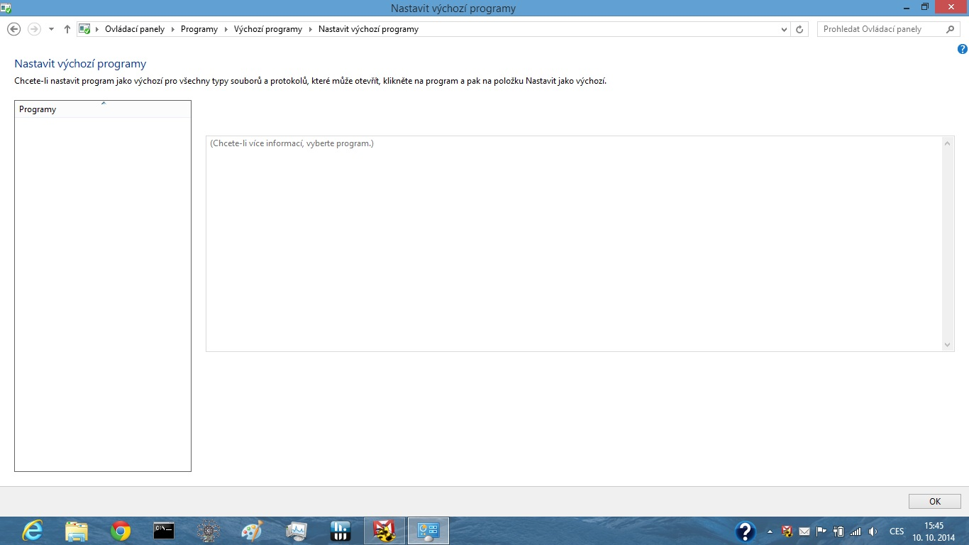 Po kliknutí na "Výchozí programy" se neotevře seznam programů, ale jen prázdná pole: