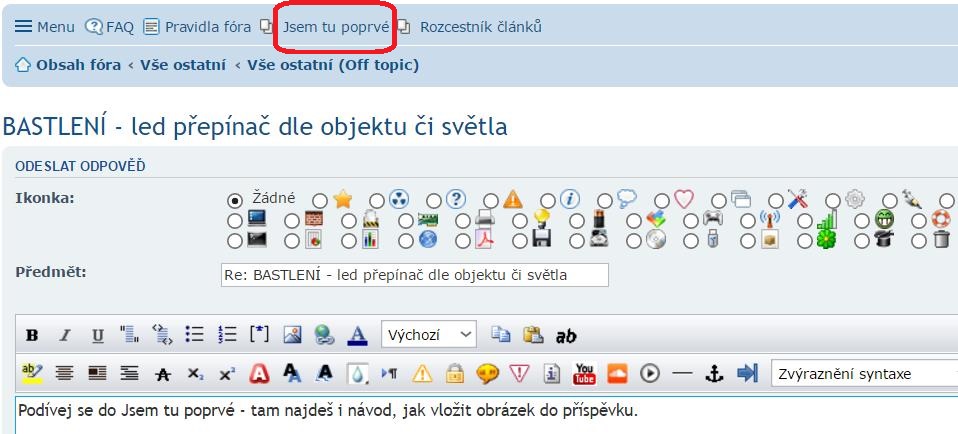 Podívej se do Jsem tu poprvé - tam najdeš i návod, jak vložit obrázek do příspěvku.