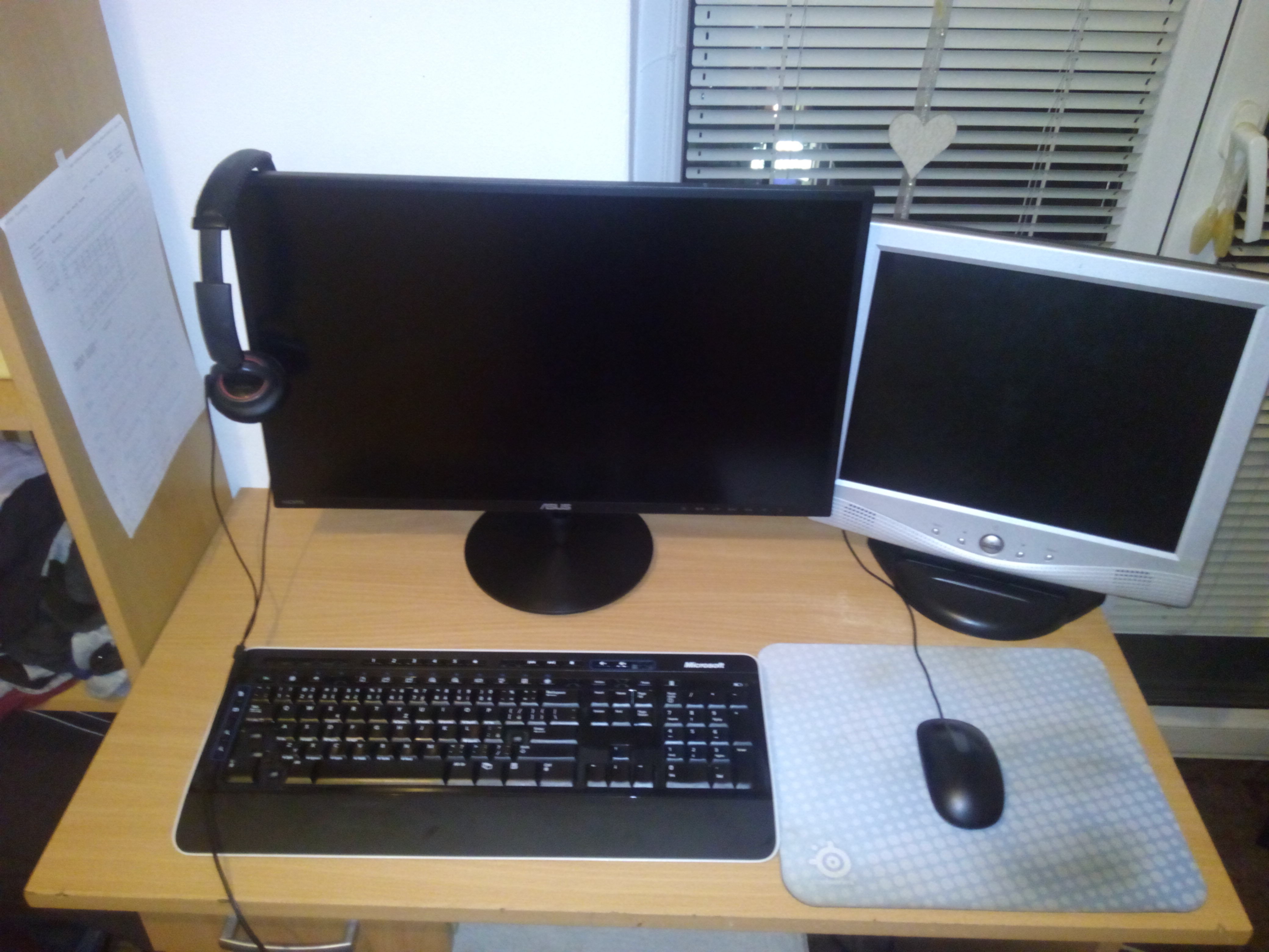 Tak změna bydliště a zároveň nové doupě. Ještě to chce držák na sluchátka. Myš na foto už je v šuplíku, bezdrátový mrkvosoft se furt nějak trhá