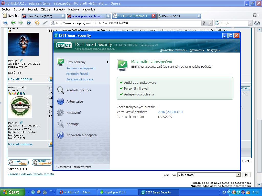Ahoj mám NOD32 Smart Security a Spyware Terminator.Stačí to na zabezpečení PC? Nebo co bych si měl popřípadně ještě sehnat.Díky za odpovědi