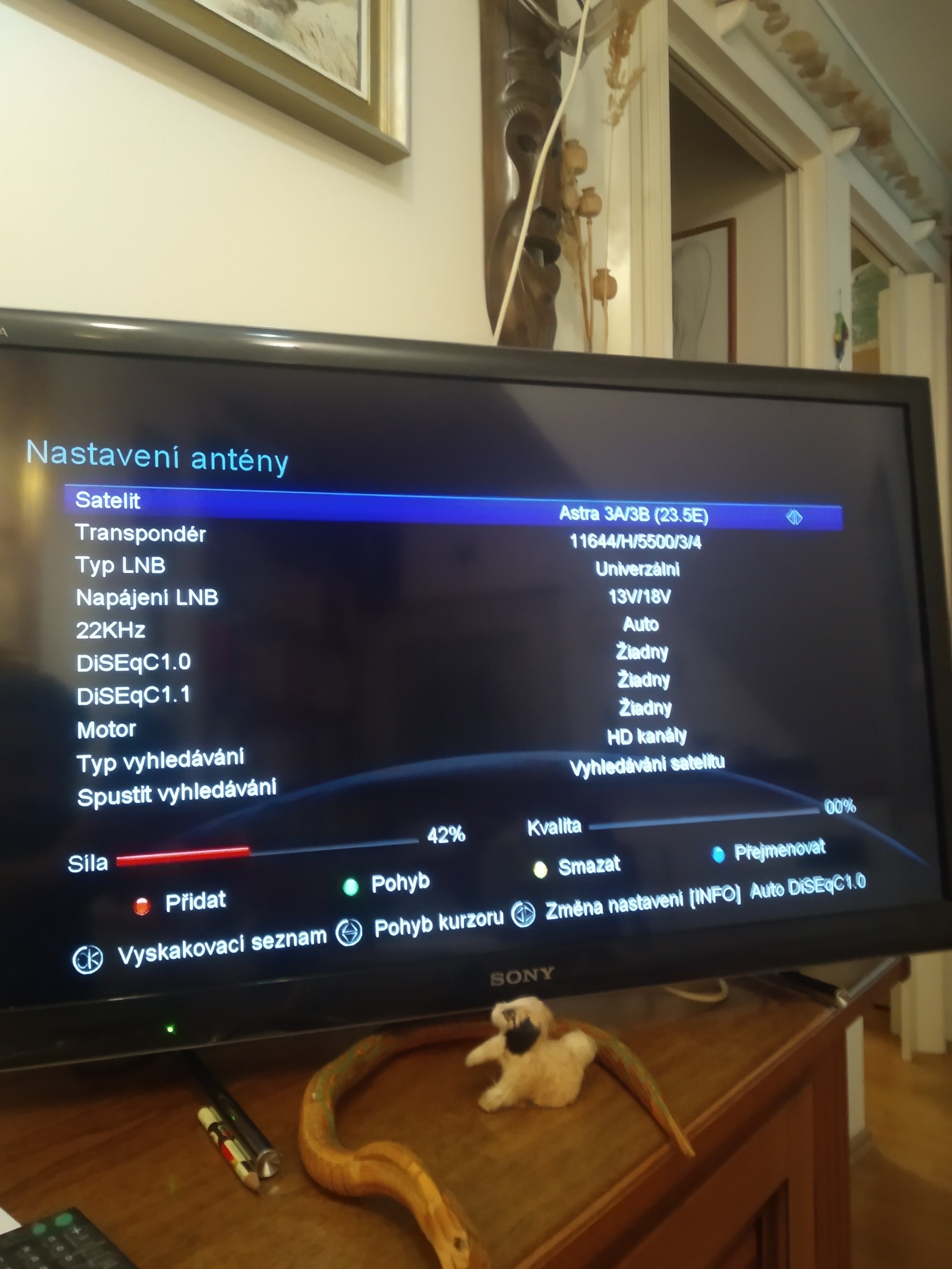 Předem se omlouvám se svojí neznalost problematiky a za málo poskytnutých informací. Pořídil jsem si nový setobox CryptoBox 752HD Combo. Mam anténu, tu zapojim do setoboxu. V menu zkouším naladit kanály, ale setobox nenaladi nic. Síla signálu se pohybuje mezi 39% a 42%, kvalita je na nule. Všiml jsem si, že když anténu ze setoboxu odpojím, očekával bych, že síla klesne na 0, ale ona zůstává stále 39-42. Setobox má funkci Fast scan. V defaultnim nastavení byl provider Skylink Slovensko, zkusil jsem s ním zapnout ladění, po 2 sekundách napíše "Frekvence Fast scan byla pozměněna" , vyhledávání skočí na 6% , poté vystoupá na 10% a znovu se vrátí na 6 a opakuje se. Skylink Česko dělá to samé, u jiných providerů hned scan po zapnutí skončí , aniž by vyhledávání došlo na 100%. Prosím poraďte. Do přílohy přikládám nastavení anteny, zkoušel jsem různé ale pokaždé dojede na 100% a nenalezne žádný kanál.