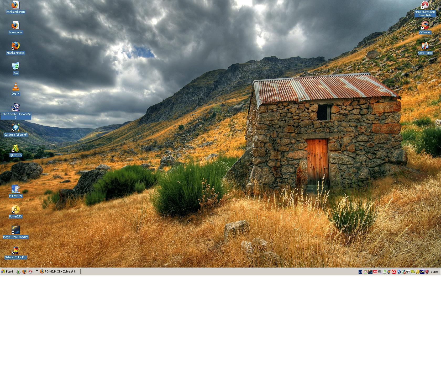 IMHO pěkná tapeta bez ikon, ale hyzdí dole ta strašidelná modrá zvětšená lišta plná ikon. Takže žádná jednoduchost. :wink: :D