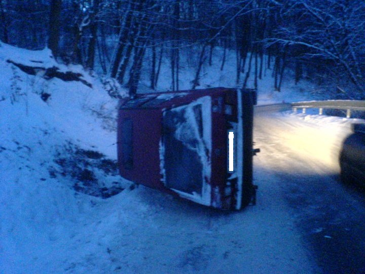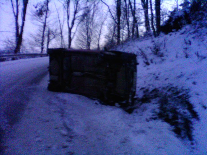 Na fotkách jsem jel do kopce v rychlosti 40 km/h smyk do prostisměru řekl jsem si lepší bude příkopa než čelí srážka, nebo svodidla a jak se zaseklo spolujezdcovo světlo o úpříkopu, setrvačnost posunula auto do jiného směru, než jsem jel a obrátila ho na muj bok.