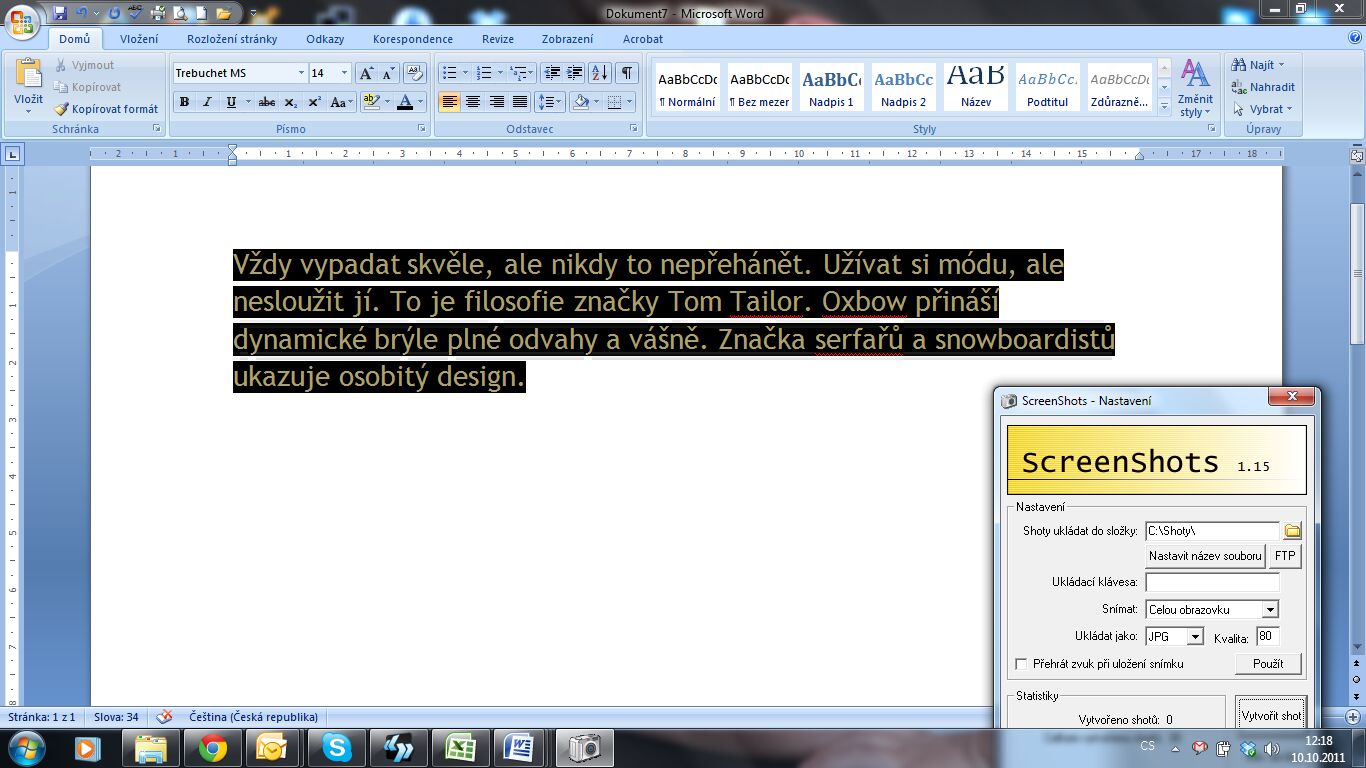 Pro ukázku jsem zkopírovala jeden text z tohoto webu, který má černé pozadí a oranžový text: http://www.svetovebryle.cz/. Ve Wordu to pak vypadá takto- viz. příloha. Barva písma změnit jde, ale nejde odstranit to černé pozadí pod písmem.