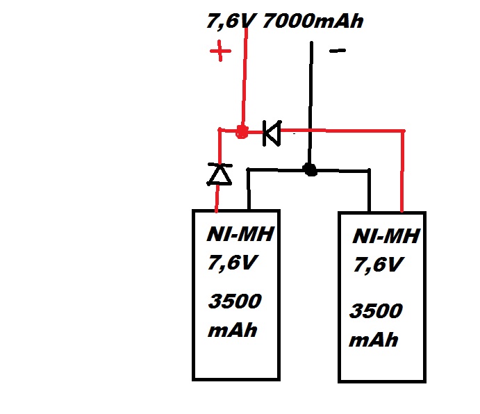 Ty diody jsou tam zbytečný, a celkový napětí bude menší o 1,4 V (2x 0,7) pokud tam ty diody budou. A to napětí těch baterek by mělo být 7,2 pokud je to Ni-MH.