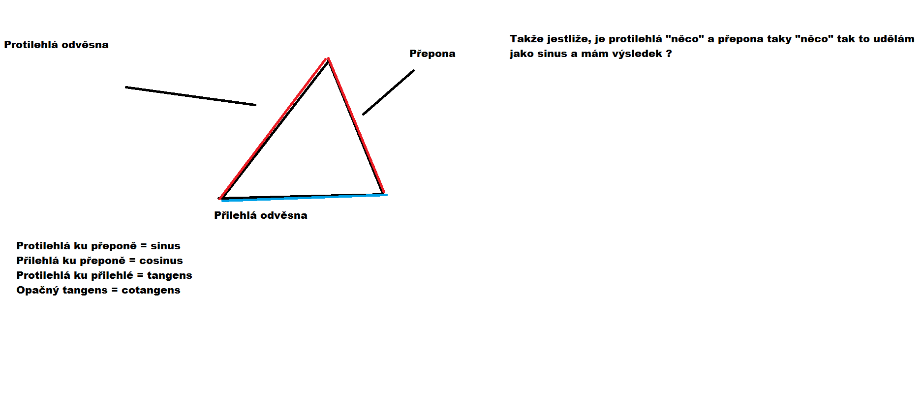 Na tom obrázku by tedy byla jedna odvěsna ta modrá (délka stínu), ta odvěsna vpravo by byla výška věže a svírá s tou modrou pravý úhel. Přepona by byla ta horní, nejdelší.