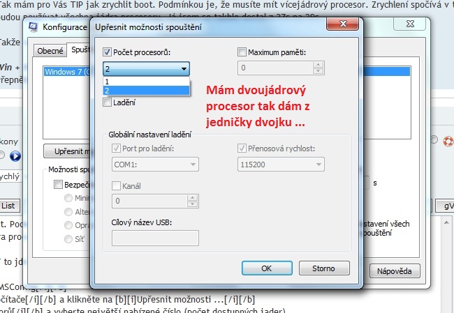 Zaškrtněte políčko Počet procesorů a vyberte největší nabízené číslo (počet dostupných jader)