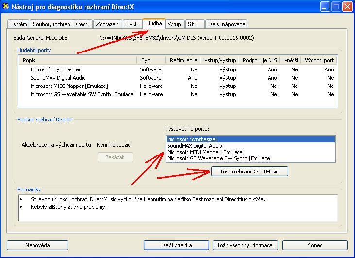 Start - Spustit - tam napiš dxdiag a potvrď. Následně na záložce hudba otestuj zvuk.