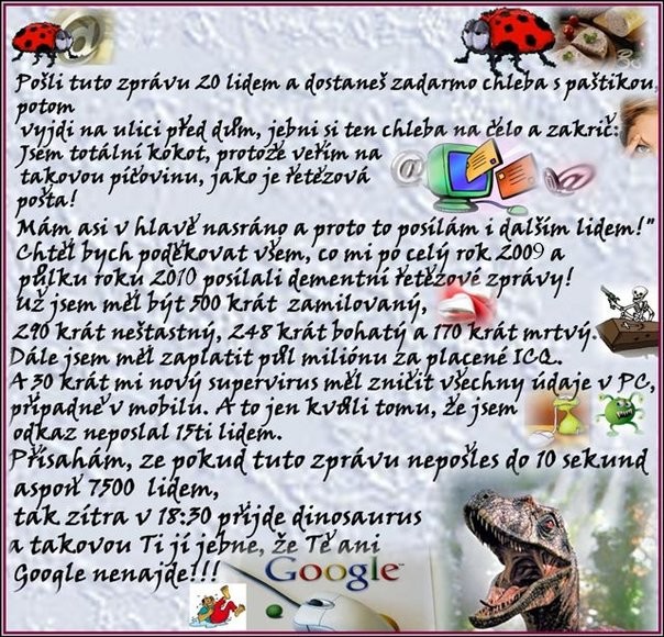 Trefný a vtipný. Hned to pošlu těm mým zarputilým rozesílačům, kterým jsem už XXXkrát říkal ať mi žádné dementní (slušně uvedeno řetězové) zprávy neposílají, že 3,14čoviny nečtu a mažu to ještě před otevřením.