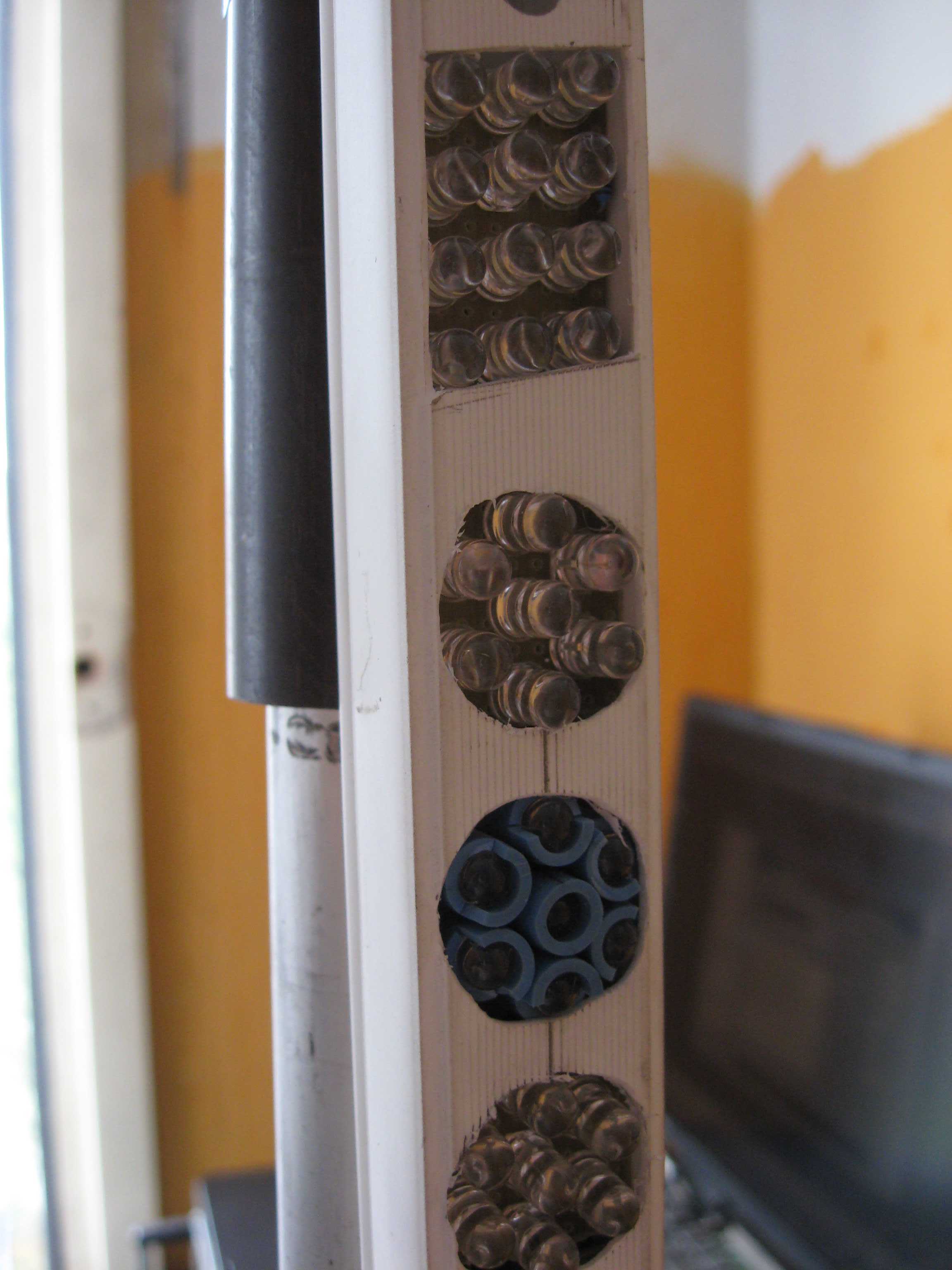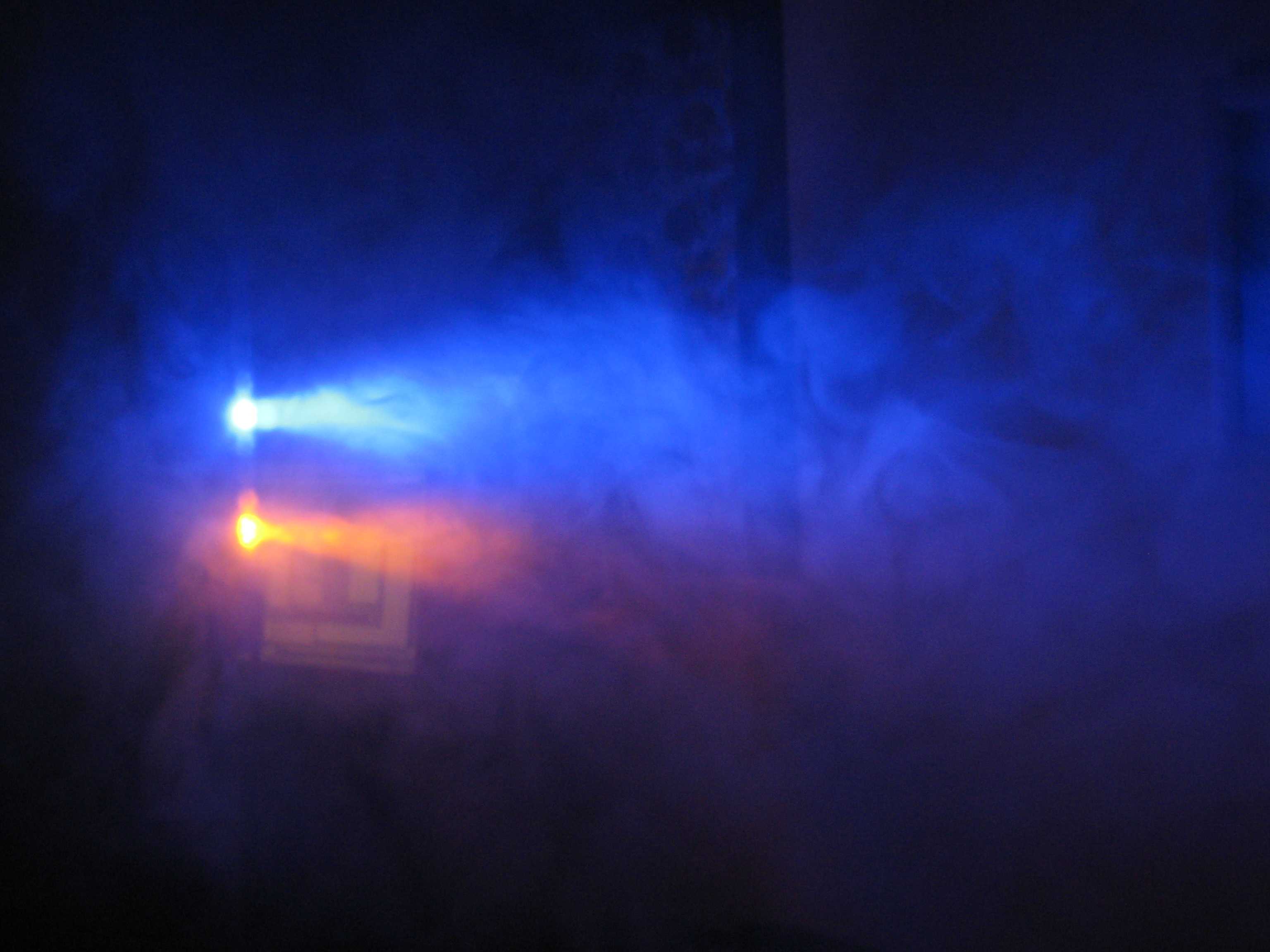 Pro ilustraci přikládám své řešení (zapojení o stránku dříve). V PVC žlabu je 6 reflektorů po 7 vysocesvítivých LED různých barev a jeden se 12 čirými. Ve 150W halogenové vaně je po 15ti R+B+G LED, které lze vzájemně kombinovat a vytvořit tak celkem 7 barev pro nasvícení plochy. Vše je provedeno ve dvou exemplářích a je tak vhodné pro nasvícení barové kapely, nebo domácího mejdanu. Nemusím snad zmiňovat, že světla nejlépe vyniknou za tmy při použití umělé mlhy, nebo v zahulené místnosti