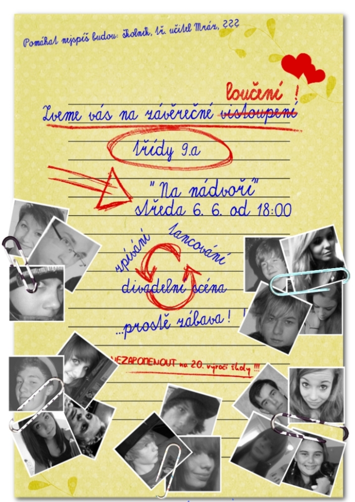 Tak fotka ta chybí tahle : http://leteckaposta.cz/751900312 . A jména : Pavel Kyselka a Lucka Skřivanová - kulisy , Bára Hloušková a Pavlína Ančincová - choreografie , Petr Schůt - Hudba . Šlo by třeba zítra doplnit další jména a třeba dvě-tří fotky ???