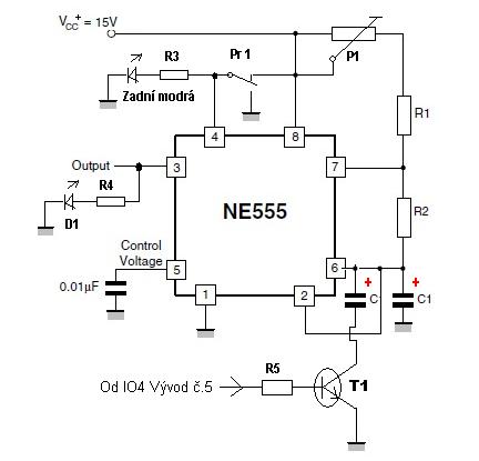 Obvod R5, T1, C zpomaluje rychlost řídících impulsů vyráběných IO NE555 zhruba o polovinu tím že ke stávající kapacitě připojí ještě jednu paralelní.