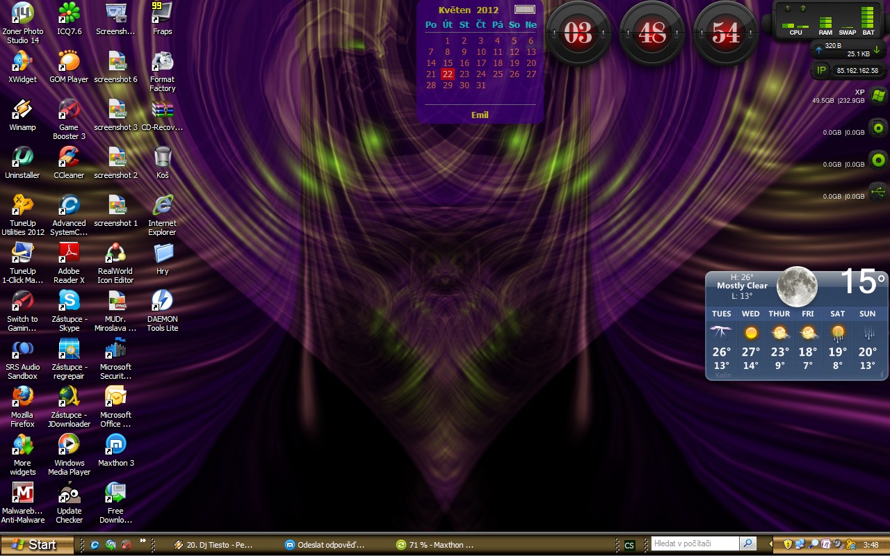 Nejlepší si dát na plochu svou tvorbu,to má pak větší váhu,nemluvě o tom,že to nikdo jiný mít nemůže,neboť je to právě jeho tvorba.Myslím tím ikony a tapety.Ikony ještě nezvládám,ale tapety jsem si vytvořil náhodou,když jsem poslouchal hudbu a koukal na vizulace a pak mne to trklo,že bych si z nich mohl vytvořit tapety