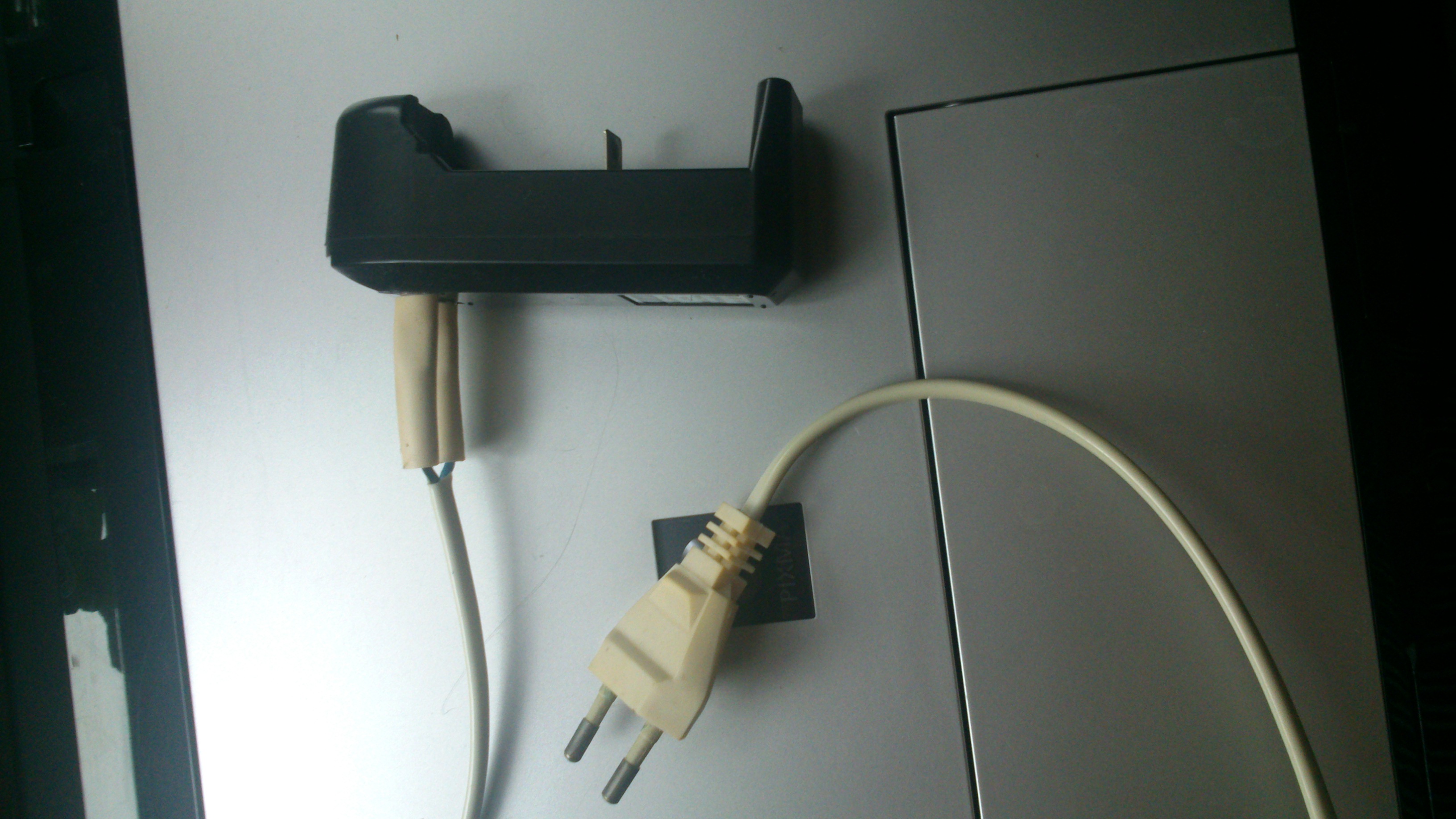 Celá nabíječka + s ručně vyrobenou přechodkou. (Kabel je ze starého gramofonu).