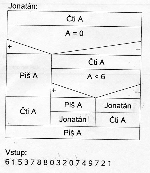 Jenže pokud to nula není, tak se načte další číslo a testuje, jestli je menší než 6. Pokud ano, vypíše se na výstup, potom se zavolá další Jonatán, a až skončí, to číslo se znovu vypíše na výstup a Jonatán skončí. Nezapomeň že každý Jonatán má vlastní proměnnou A, takže ten předchozí si stále pamatuje to co tam bylo načtené.