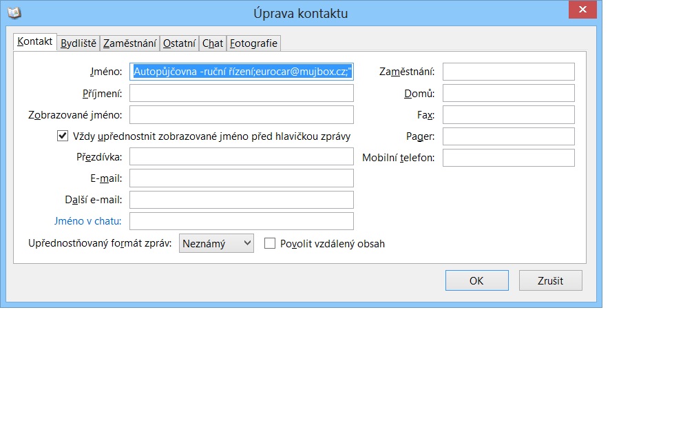 Mám další program LiveMail 2012 - byl součástí WIN 8. Z něj jsem si všechny kontakty exportoval ve formátu CSV. Ten LiveMail se mi nelíbí, tak jsem si nainstaloval TB a chtěl bych si do něj všechny kontakty z Live překopírovat, ale zatím se mi nedaří. Vždy se mi zkopírují adresy takto - viz příloha, takže adresář nefunguje.