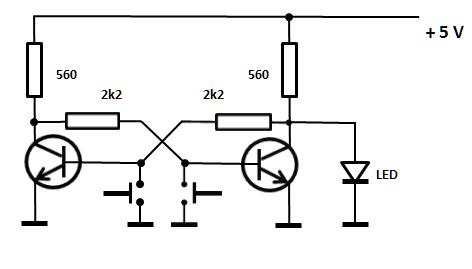 Pravé tlačítko je S - LEDku rozsvěcí, levé je R - zhasíná. Tranzistory jakékoliv, pokud se nepletu např. BC 810 je dvojitý tranzistor, i ten by se dal použít. Proud diodou je nastavený na cca 20 mA. Není ošetřené nastavení do určitého stavu při připojení napájecího napětí, pokud by to bylo požadované, připojit paralelně k tlačítku R elyt +/- 1 mikro, kdyby to nestačilo, dát větší.