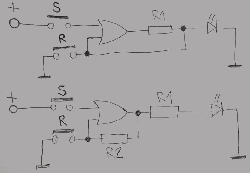 V prvním případě je potřeba ten odpor "naladit" tak aby LED svítila a zároveň se hradlo OR zvládlo udržet sepnuté, v druhém je to jistější, ale zase by bylo potřeba ty odpory proti sobě vyvážit.