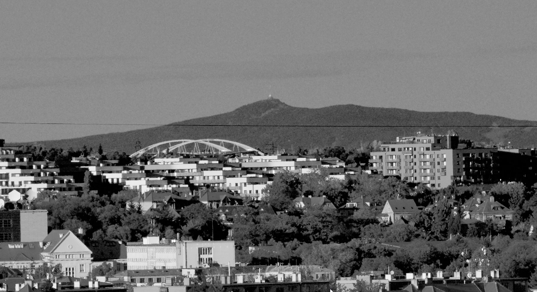 Takto je z centra Prahy videt Jested (ty oblouky jsou autobusove garaze na Klicove):
