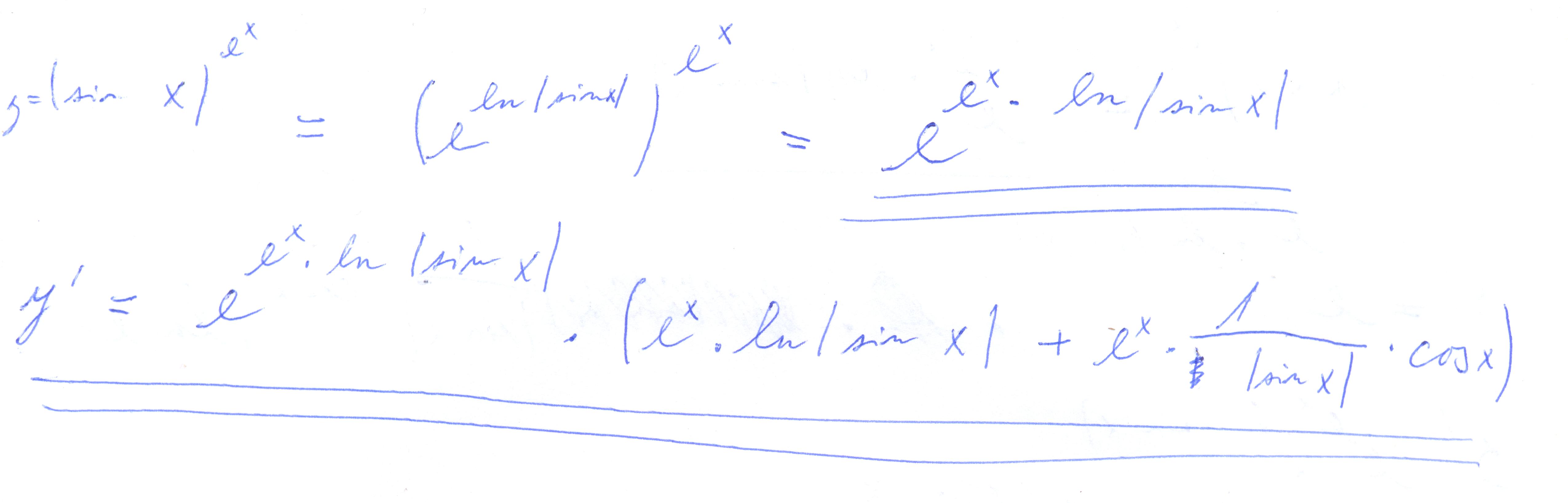 Takže oprava, trochu jsem o tom přemýšlel a radil se a nakonec jsem došel k závěru, že od e^x nejde jednoduše odečíst 1.Celý výraz se musí převést na mocninu e a pak teprve zderivovat.Podle mě se pak dá aplikovat pravidlo pro derivaci-nejdříve zderivovat základ (který se v tomto případě nemění) a pak zderivovat exponent jako složenou funkci.