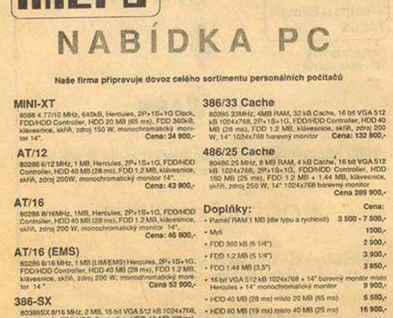 Níže přikládám ceník hardwaru z dob totality.Největší "dělo" počítač má 25Mhz procesor a stojí asi 150 tehdejších měsíčních platů.Při dnešní průměrné mzdě,by jste si tenkrát mohli koupit 80MB harddisk