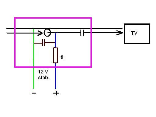 Jednak nechápu ten obrázek, protože jak je známo, kondenzátorem stejnosměrný proud neprochází (tedy pokud šipky ukazují směr k zesilovači). Zkus změřit napětí na konci koaxiálního kabelu v zesilovači u antény.