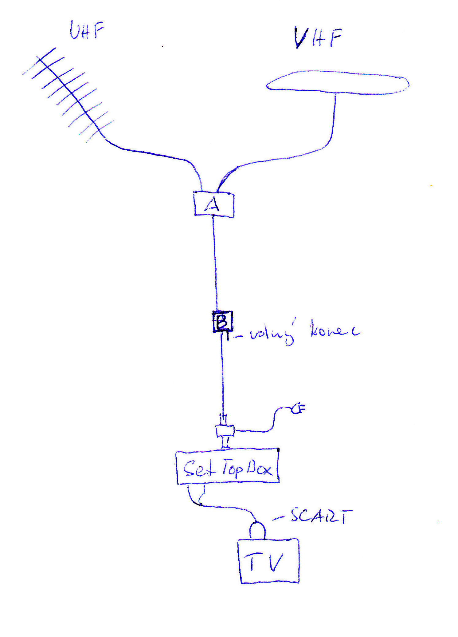 V čem muže být zakopaný pes? V "rozdělovači" B jsem odpojil celou tu větev (žlutou) která je na satelit, aby to zbytečně nerušila.