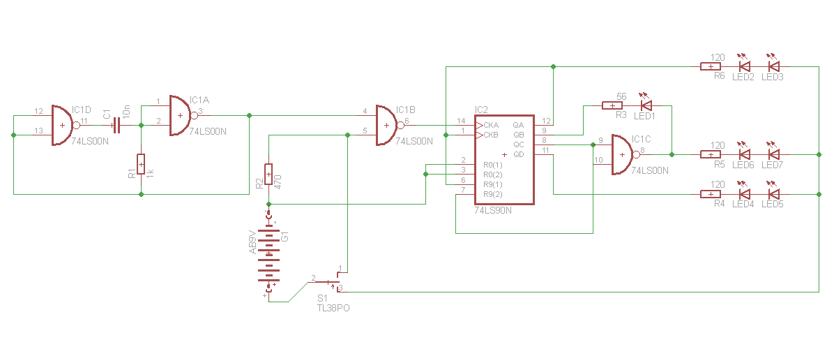 Dostali jsme ve škole schema na zapojení hrací kostky z TTL + odpory, kondenzátory, diody, a mám (máme, celá třída) problém to zprovoznit.