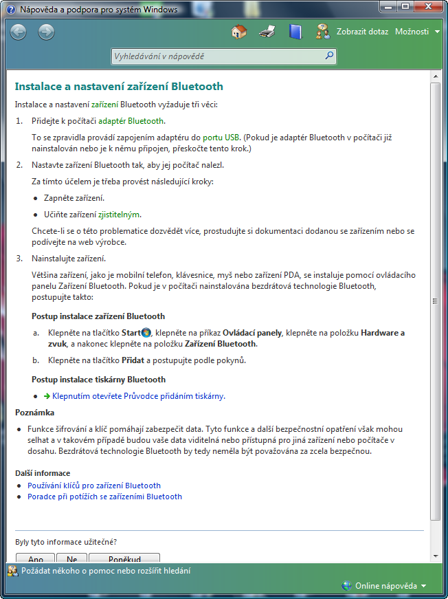 Nějaká nápověda je ti k ničemu. Co je to za počitač? BT je v něm intgrovaný anebo připojuješ do USB? Už byl někdy v provozu?