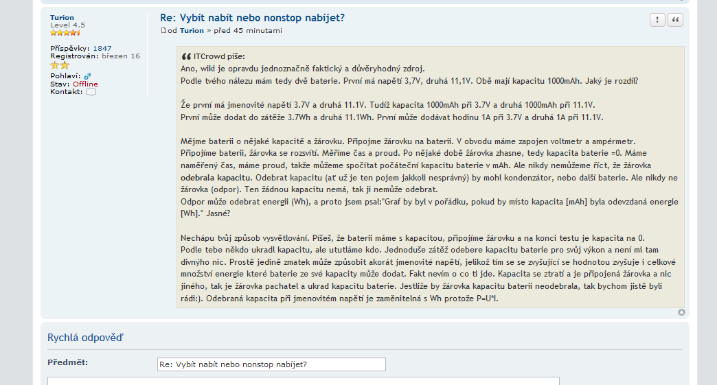 "Kapacita se ztratí a je připojená žárovka a nic jiného, tak je žárovka pachatel a ukrad kapacitu baterie. " Tohle jen dokazuje, jak hloupý a neznalý jsi :-)