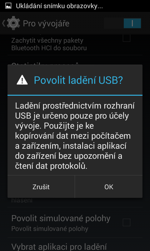 Zapátral jsem v nastavení mého mobilu a našel jsem již zmiňované "Ladění USB" Běžte do nastavení a skoro dole by jste měl mít položku "Pro vývojáře" položku rozklikněte a pokud není povolená, posunutím, či klepnutím na "páčku" povolte. Mělo by se vám vše "rozjasnit" Následně najděte položku "Ladění USB" a povolte ji. Mobil Vás upozorní a vy potvrďte stisknutím OK. Přikládám Screenshoty z mého mobilu.