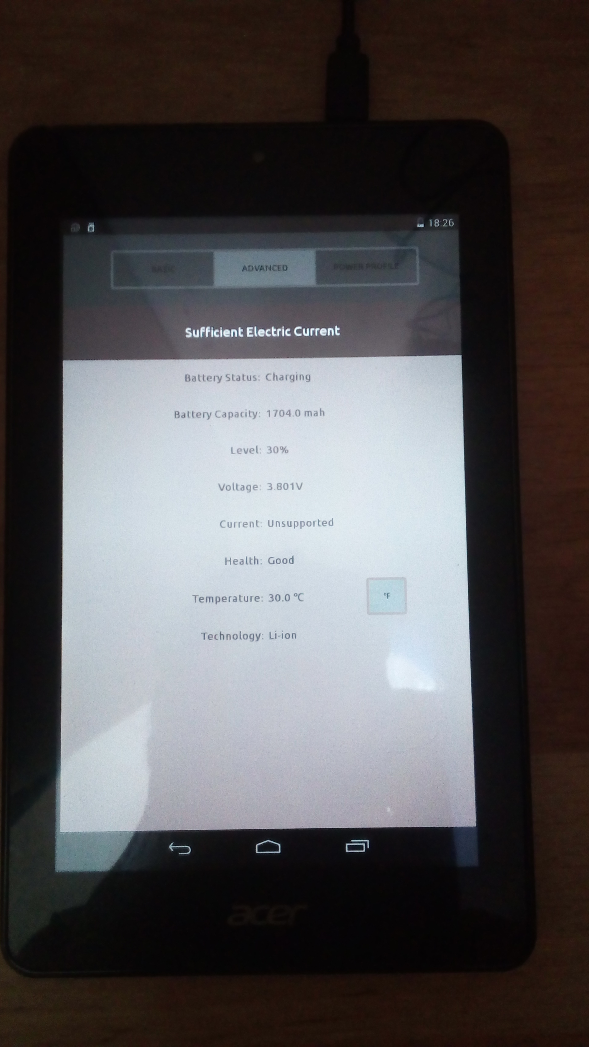 Mám menší problém s tabletem Acer Iconia One 7, který už několik týdnů ukazuje úroveň nabití 30% bez ohledu na skutečný stav nabití. Baterie se nabíjí, protože při připojení nabíječky stoupá napětí baterie. Problém je ale v tom, že skutečný stav nabití mohu pouze odhadovat podle napětí a podle zkušeností s používáním.