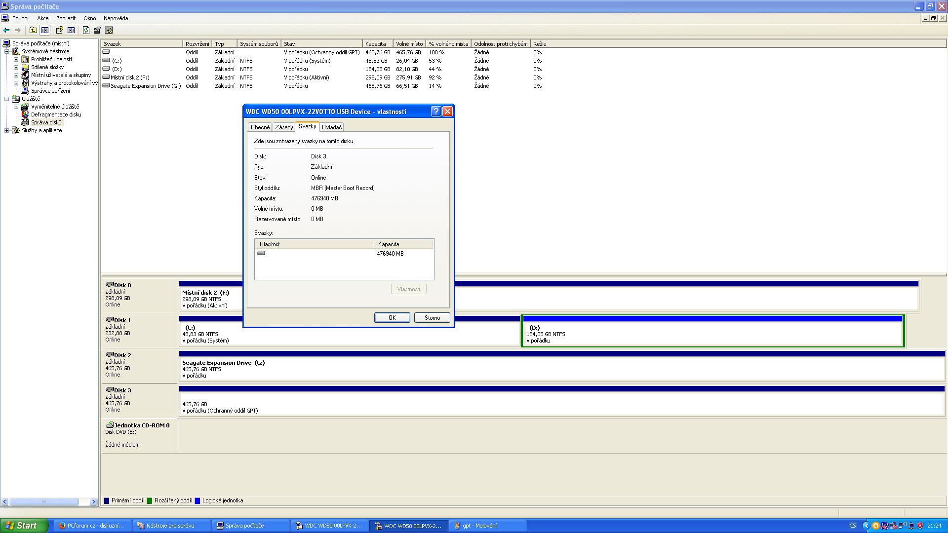Když disk připojím k PC přes USB, PC jej identifikuje, ale nezobrazí - zřejmě proto, že nejsou nastaveny oddíly. Přes správce úložišť se mi zobrazí to, co je v příloze. Nejde s tím však nic dělat.