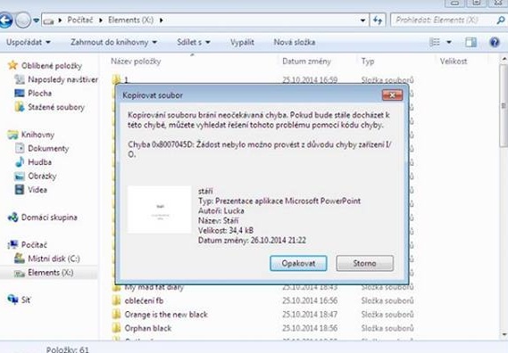 Tak mi kamarád přeinstaloval Visty na Win7 a přepsal mi písmenko disku a konečně se mi v pc otevře, ale je tu jiný problém. Soubory mohu z disku přesunout na plochu, ale z plochy na disk ne, to se mi objeví toto hlášení na obrázku. Jinak soubory na disku otevřít jdou, ale stává se, že když ho chci otevřít tak se někdy píše že je prázdný přitom není. Tak prosím nevíte co s tím teď? děkuji
