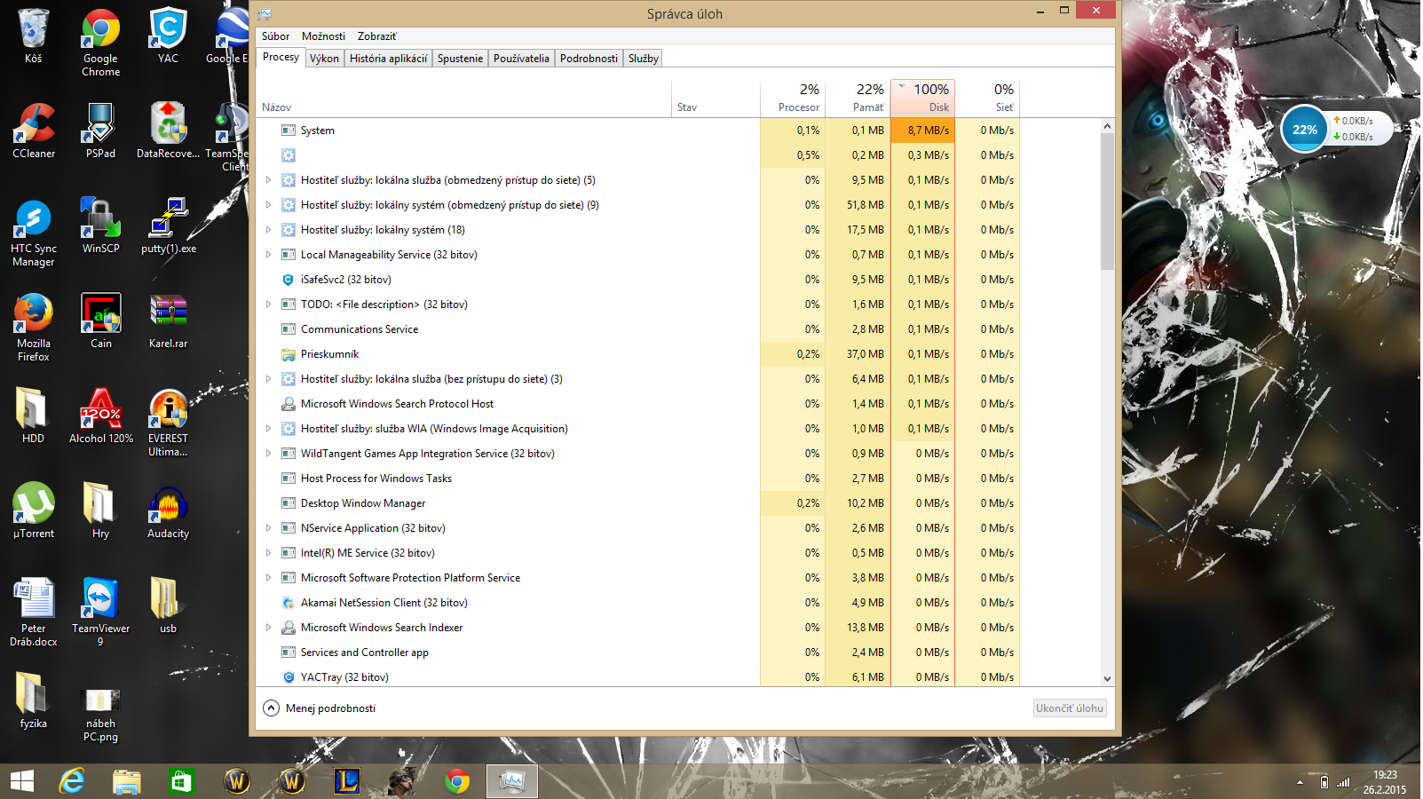 mi môj HDD pracuje na 100% čo spomaľuje chod notebooku. Niekedy pracuje aj dobrých 5-10 minút no neostáva mi nič iné len počkať kým sa "ukľudní". Notebook je nový, kupovaný v auguste/septembri 2014. Zatiaľ čo som pozoroval tak zvyčajne to neboli ani vysoké hodnoty ktoré zaťažovali disk. Bolo to napríklad "Hostiteľ služby: lokálny systém" a ten zamestnával HDD 1,2 až 2,5 MB/s. Nevedeli by ste niekto čo to môže spôsobovať a ako by sa to dalo odstrániť?