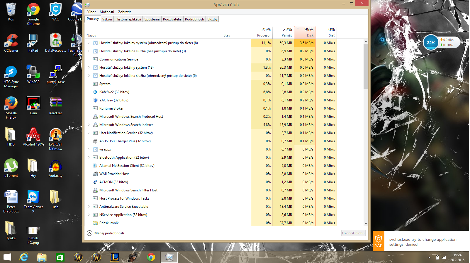 Na mojom notebooku nemám žiaden nejaký extra antivírový program. Používam iba YAC (Yet Another Cleaner) ktorý má v sebe internet protection, virus detection junk, adware a ďalšie veci. Jednou z nich je aj to, že blokuje procesy, ktoré sa chcú samé bez môjho vedomia meniť. Ako ste si mohli všimnúť v predošlom príspevku na prvom obrázku, zamietlo to zmenu programu svchvost.exe ktorý sa snažil zmeniť nejakú aplikáciu. Mohla by byť chyba aj v tom?