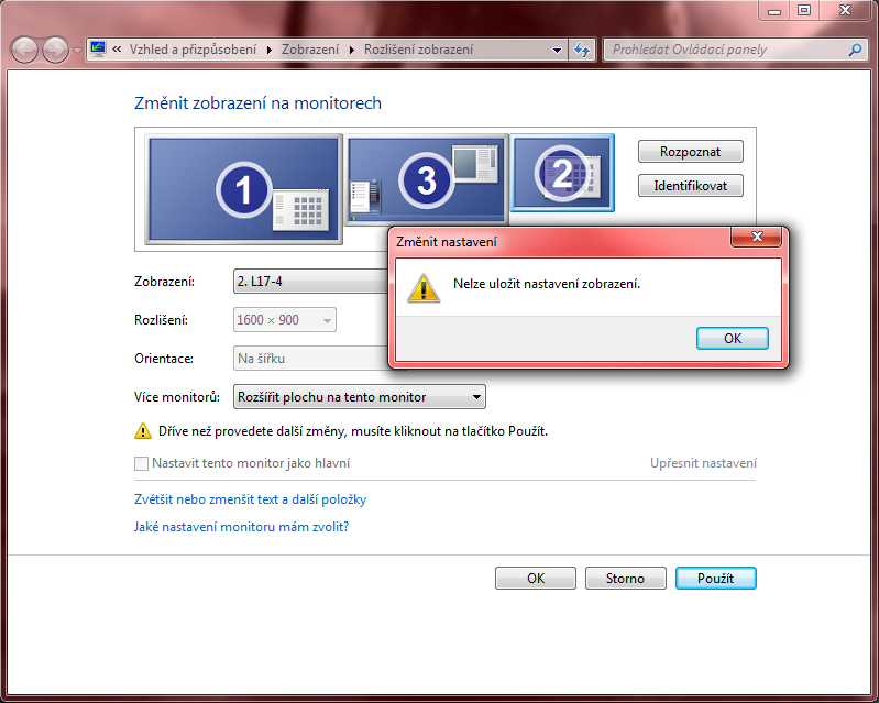 mám zapojené dva monitory přes VGA, nyní jsem připojil i TV přes HDMI a když chci, aby fungovali všechny tři zařízení najednou, tak to nelze. V nastavení zobrazení mi to hází chybu (viz screen).